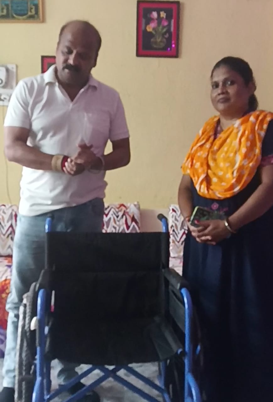 *ही व्हीलचेअर पुणे बी.टी.कवडे रोड येथील राहणाऱ्या श्रीमती आशाताई यांनी आपल्या दिवंगत पतीच्या स्मरणार्थ मधु ताराला यांच्या निःस्वार्थ कार्याला बघून गरीब रुग्ण दिग्यांग यांना भेट म्हणून दिली.*