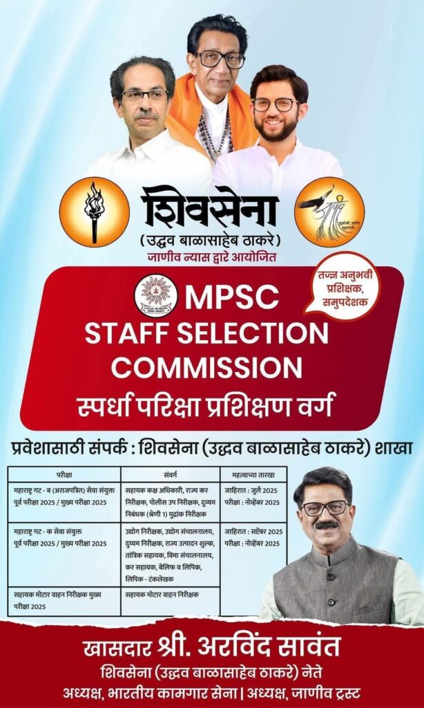 शिवसेना नेते, खासदार *श्री. अरविंद (भाई) सावंत आणि जाणीव संस्थेच्या वतीने मराठी तरुणांना* *शासकीय नोकऱ्या मिळाव्यात यासाठी एम. पी. एस. सी व स्टाफ सिलेक्शन कमिशन भरतीसाठी ज्या परीक्षा घेतल्या जातात त्याचे “प्रशिक्षण वर्ग” सुरू करण्यात येणार आहेत. येत्या जून २०२५ मध्ये हा उपक्रम सुरू करण्याचे नियोजन केले आहे. साधारणत: डिसेंबर २०२५ दरम्यान या नोकर भरतीची लेखी परीक्षा होणार आहे. *एम. पी. एस. सी* व *स्टाफ सिलेक्शन कमिशन* या *प्रवर्गाच्या लेखी परीक्षा* होणार असुन