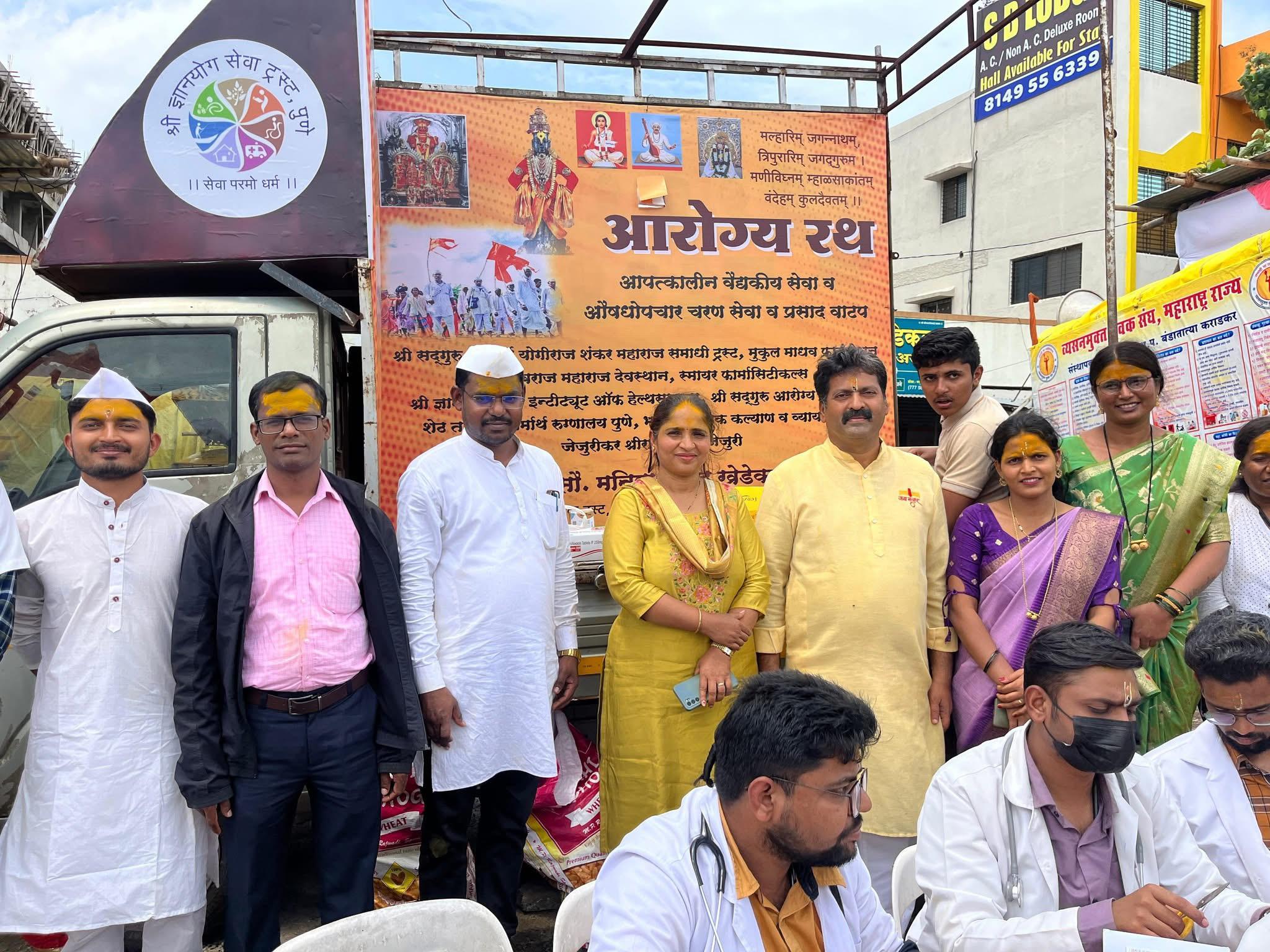 जेजुरी ग्रामीण रुग्णालयाच्या वतीने आषाढी वारी निमित्त वारकऱ्यांसाठी कर्करोग निदान व जागरूकतेसाठी मोफत आरोग्य तपासणीचे आयोजन करून आरोग्य रथाच्या माध्यमातून ३०८ रुग्णांची तपासणी करण्यात आली .आरोग्य रथाचे उद्घाटन श्री मार्तंड देवस्थानाचे विश्वस्त डॉ .राजेंद्र खेडेकर व जेजुरी ग्रामीण रुग्णालयाचे अधीक्षक डॉ .प्रताप साळवे यांच्या हस्ते करण्यात आले.