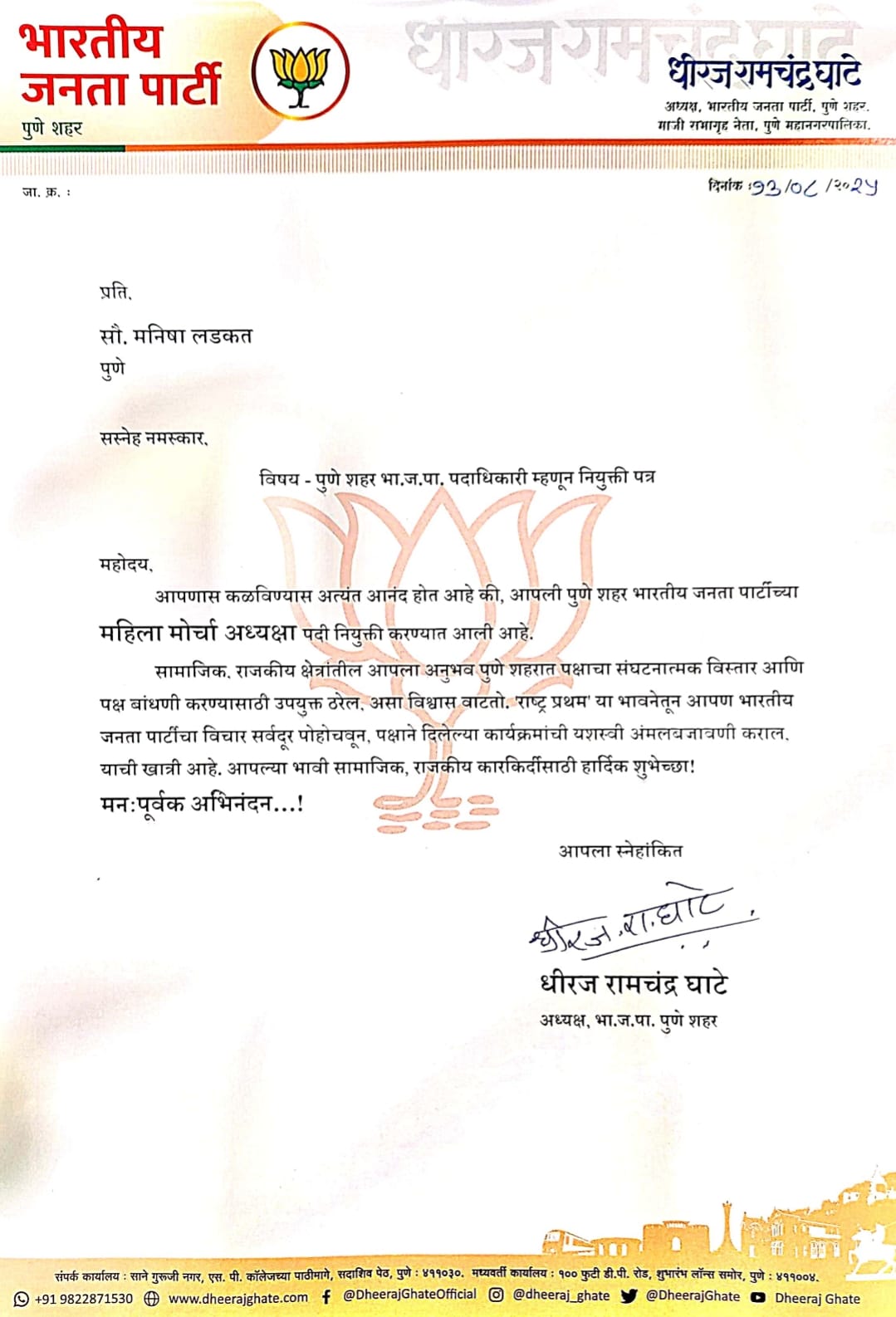 शहराध्यक्ष धीरज घाटे यांच्या हस्ते नियुक्तीपत्र देण्यात आले, मनीषाताई लडकत 2017 ते 2022 पर्यंत पुणे महापालिकेमध्ये नगरसेविका म्हणून काम पाहिले ते पुणे महापालिकेच्या विधी समिती अध्यक्षपदी महिला बालकल्याण समिती सदस्य पदी शहर सुधारणा समिती सदस्य पदी व भवानी पेठ क्षेत्रीय कार्यालय प्रभाग समितीच्या अध्यक्षपदावर कार्यरत होते, पक्षाच्या विविध कार्यक्रमांमध्ये उपस्थिती राहून त्यांनी जबाबदारी पार पाडल्या व विविध समाजातील कार्यक्रमांमध्ये सहभाग होऊन संयोजन करून जबाबदारी पार पाडली त्याची दखल घेऊन भाजपा नेत्यांनी त्यांना पुणे शहर महिला मोर्चाच्या अध्यक्षपदी जबाबदारी दिली,