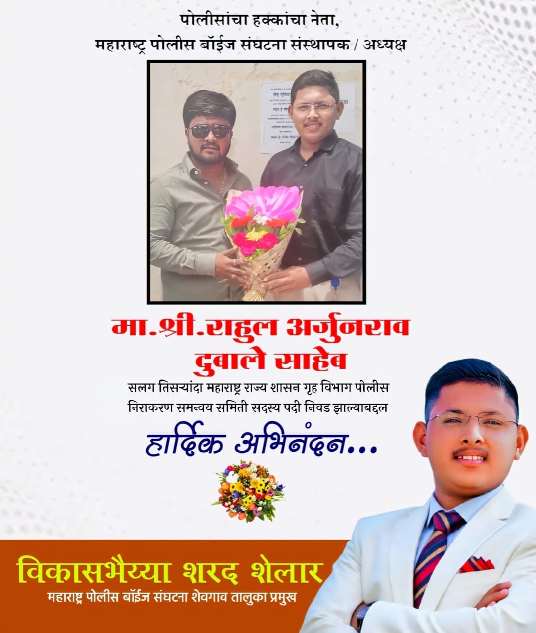 या निवडीबद्दल महाराष्ट्र पोलीस बॉईज संघटना शेवगाव तर्फे तालुका अध्यक्ष दिपक मोहिते सर, शेवगाव तालुका प्रमुख विकासभैय्या शेलार, सर्व पदाधिकारी यांनी त्यांचे मनःपूर्वक अभिनंदन केले. “दुबाले साहेबांच्या नेतृत्वामुळे पोलीस बांधवांच्या अपेक्षांना न्याय मिळेल आणि संघटनेचे कार्य राज्यभर अधिक प्रभावीपणे पुढे जाईल,” असा विश्वास त्यांनी व्यक्त केला.