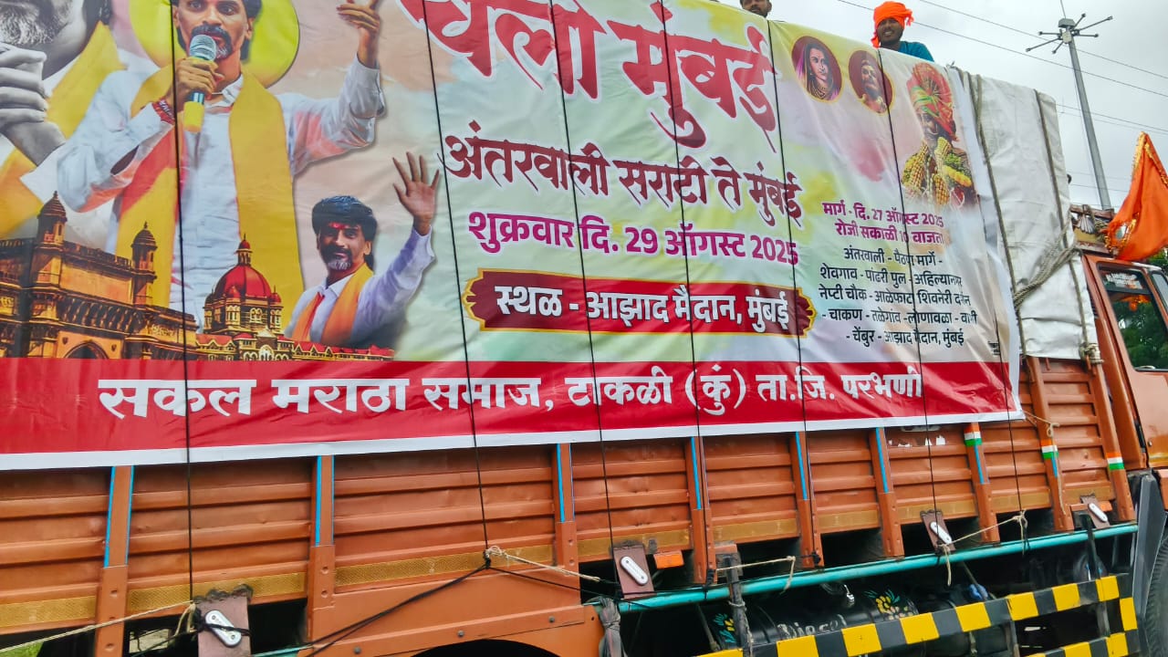 मराठा आरक्षणासाठी आंतरवली सराटीच्या (मुंबई) दिशेने ट्रक टेम्पो छोटा हत्ती दिशेने सकल मराठा समाजाचे गरजवंत मराठे आज मुंबईच्या दिशेने रवाना मा. मराठा योध्दा गरजवंत मराठ्यांच्या न्याय हक्कासाठी मनोज जरंगे पाटील यांच्या आवाहनाला मोठा प्रमाणात आज गरजवंत मराठ्यांनी प्रतिसाद दिला. मोठे आवाहन अडथळे पार करीत मोर्चा मुंबईच्या दिशेने कूच केला तर राजकीय नेतृत्वाला साखर झोपेतून जागे करण्याचे काम आता जनताच करणार असल्याचे मत नागरिक व्यक्त करीत आहे.