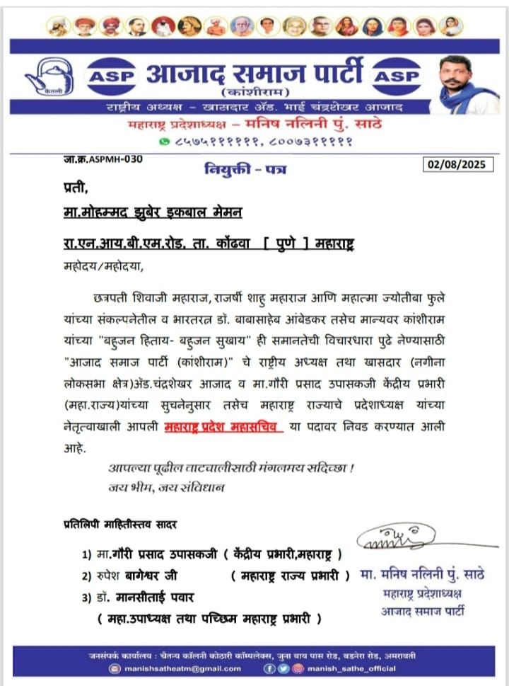 पुणे | महाराष्ट्र मुस्लिम कॉन्फरन्सचे संस्थापक अध्यक्ष व समाजसेवक हाजी जुबैर मेमन यांची आझाद समाज पार्टी महाराष्ट्र प्रदेश महासचिव म्हणून नियुक्ती करण्यात आली आहे. ही नियुक्ती पक्षाचे राष्ट्रीय प्रवक्ते (महाराष्ट्र प्रदेश) गौरीप्रसाद उपासक, महाराष्ट्र प्रदेश अध्यक्ष मोनीस साठे आणि महाराष्ट्र प्रदेश युवा अध्यक्ष सुलतान शाह यांच्या हस्ते नियुक्तीपत्र देण्यात आले,