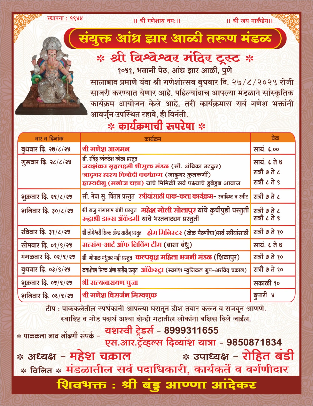 सालाबाद प्रमाणे यावर्षी गणेशोत्सवानिमित्त संयुक्त आंध्र झार आळी तरुण मंडळातर्फे मंडळाच्या आवारामध्ये दिनांक 28 ऑगस्ट ते 3 सप्टेंबर पर्यंत विविध सांस्कृतिक कार्यक्रमाचे आयोजन केले आहे, यामध्ये जादूगर हास्य विनोद कार्यक्रम, स्त्रियांसाठी पाकाला स्पर्धा, लहान मुलांसाठी डान्स स्पर्धा भरतनाट्यम, होम मिनिस्टर कार्यक्रम, सत्संग आर्ट ऑफ लिविंग टीम, कल्पवृक्ष महिला भजनी मंडळातर्फे भजनाचा कार्यक्रम, ऑर्केस्ट्रा गाण्याचा कार्यक्रम असे विविध कार्यक्रम होणार आहे,