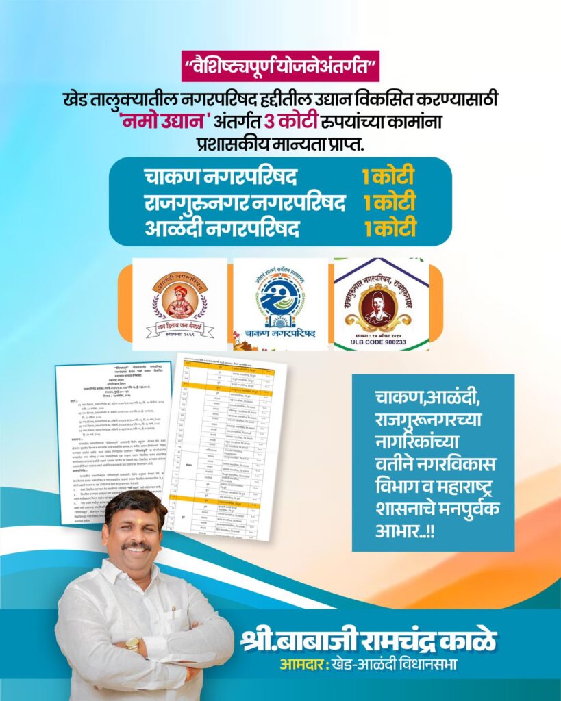 राजगुरूनगर,चाकण,आळंदी नगरपरिषद क्षेत्रात नमो उद्यान विकसित करण्यासाठी तब्बल ३ कोटी रुपयांचा निधी मंजूर!
