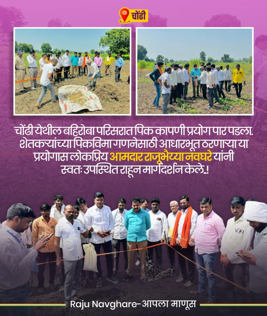 .राज़्य शासनाने शेतकरी लाभार्थ्याना आर्थिक दिली आहे.शेतातील पिकाचे मोठे नुकसान झाले आहे.शेतकऱ्याचे भावनेला न्याय देण्यासाठी प्रत्यक्ष शेतातील पिकांची परिस्थिती बिकट बनली असताना शेतकर्या शेतावर सोबत आज मातीत घाम गाळणाऱ्या शेतकऱ्याच्या परिश्रमाला योग्य मूल्य मिळावं, हाच आमचा प्रयत्न खरा ठरवण्यासाठी आज चोंढी येथील बहिरोबा परिसरात पिक कापणी प्रयोग पार पडला. या प्रयोगातून मिळणारे उत्पादन हे शेतकऱ्यांच्या पिकविमा गणनेसाठी अत्यंत महत्त्वपूर्ण ठरणार आहे.