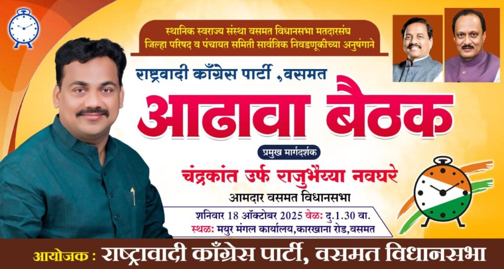 या बैठकीला वसमत मतदारसंघातील राष्ट्रवादी काँग्रेस पक्षाचे सर्व कार्यकर्ते उपस्थित राहणार आहेत.