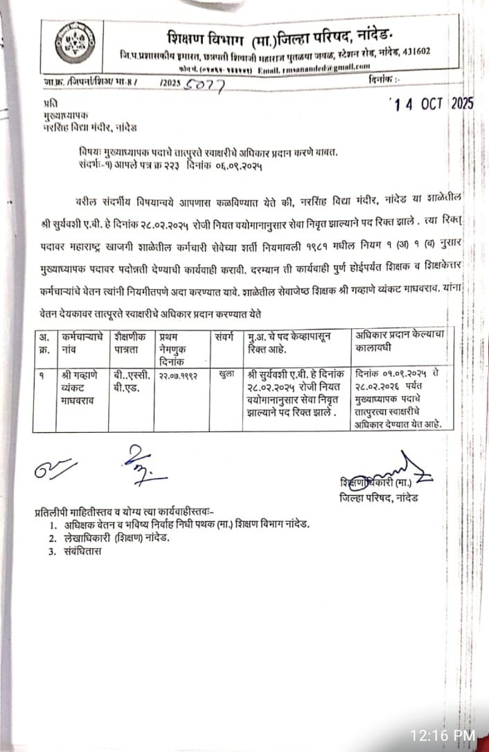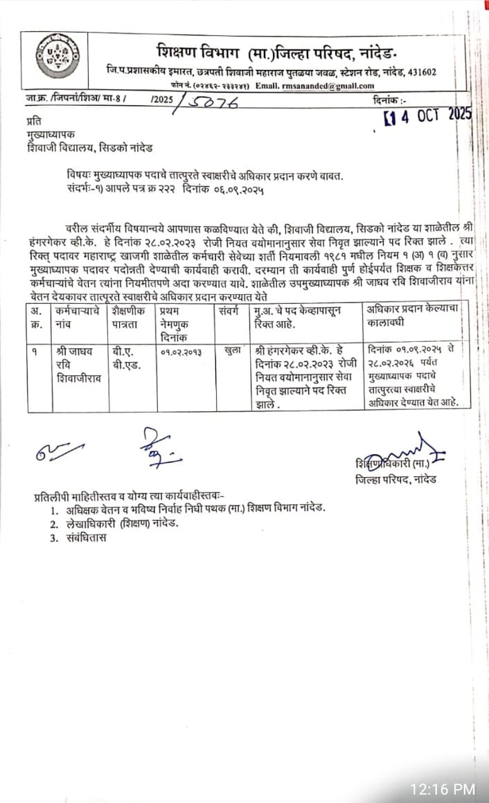जनता शिक्षण मंडळाचा तोतया व स्वयंघोषित अध्यक्ष जाधव यांनी मुख्याध्यापक पदी नियुक्त केलेल्या देवरे व गौड यांची शिक्षणाधिकारी नांदेड यांचे कडून हकालपट्टी