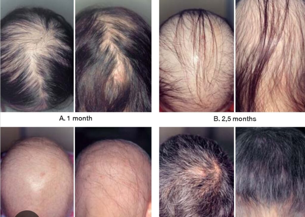 बाधित व्यक्तींमध्ये, विशेषत: महाविद्यालयीन विद्यार्थी आणि तरुण मुलींमध्ये, लक्षणे दिसल्यानंतर अवघ्या तीन ते चार दिवसांत संपूर्ण टक्कल पडल्याचे (Total Baldness) दिसून आले.