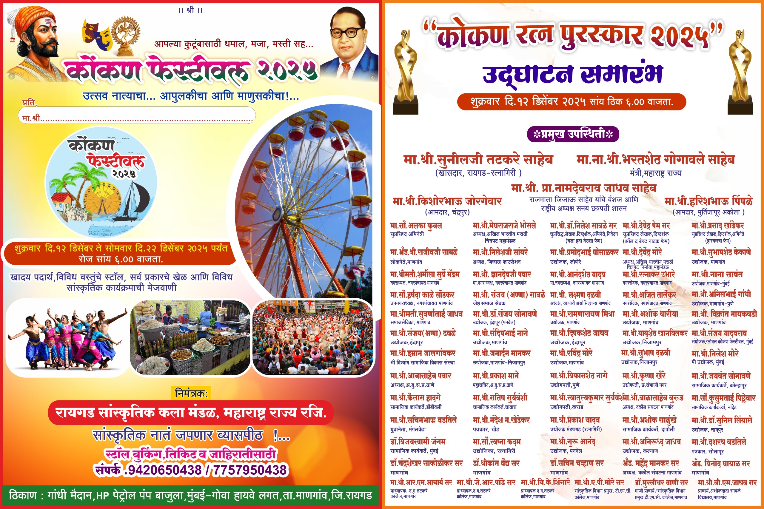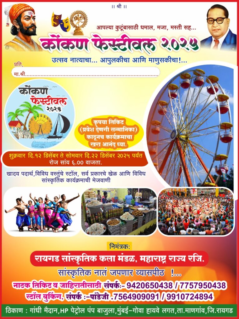 महाराष्ट्रातील विविध क्षेत्रांतील उल्लेखनीय काम करणाऱ्या असामान्य व्यक्तिमत्त्वाचा विशेष सन्मान प्रमुख पाहणे यांच्या हस्ते केला जाणार आहे. सदर फेस्टिव्हल मध्ये शाळा व कॉलेजमधील विद्यार्थांचे विविध सांस्कृतिक कार्यक्रम, शॉर्टफिल्म फेस्टिव्हल, काव्य वाचन, गीत गायन, अभिनय स्पर्धा, लावण्यवती स्वाती पुणेकर यांचा लावणी महोत्सव कार्यक्रम, बॉडी बिल्डींग, रेकॉर्ड डान्स आणि खास कोकण सुंदरी अशा अनेक स्पर्धा तसेच १४ भाषेत आणि ४५०० हुन जास्त विक्रमी प्रयोग केलेला कौटुंबिक विनोदी नाटक ऑद द बेस्ट, तसेच महाराष्ट्राचा सुपरस्टार आणि हास्य टॉनिक भाऊ कदम यांचा सिरीयल किल्लर हा धमाल कौटुंबिक विनोदी नाटकसह अशा विविध सांस्कृतिक कार्यक्रमाची अस्सल मेजवाणी खास दर्दी व हौशी रसिक प्रेक्षकांना पाहावयास मिळणार आहे. तरी माणगांवात प्रथमच होणा-या या कोकण फेस्टिव्हल – २०२५च्या उद्घाटन सोहळ्यास शुक्रवार दिनांक १२ डिसेंबर २०२५ रोजी सांय ठिक ६.०० वाजता रायगड कोकणातील सर्व प्रेक्षकांनी जास्तीत जास्त संख्येने उपस्थित राहावे असे आवाहन रायगड सांस्कृतिक कला मंडळ, महाराष्ट्र राज्य व सांस्कृतिक नातं जपणार व्यासपीठचे निमंत्रक व संस्थापक – अध्यक्ष डॉ. अजय आत्माराम मोरे आणि सेक्रेटरी सौ. सौ. अकिता मोरे तसेच कार्याध्यक्ष सौ. प्रमिला हितेन भाई छेडा व सर्व पदाधिकारी यांनी केले आहे.