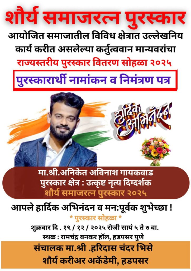 शौर्य समाजरत्न पुरस्कार” महाराष्ट्र पुणे येथील प्रसिद्ध नृत्य दिग्दर्शक अनिकेत अविनाश गायकवाड यांची निवड