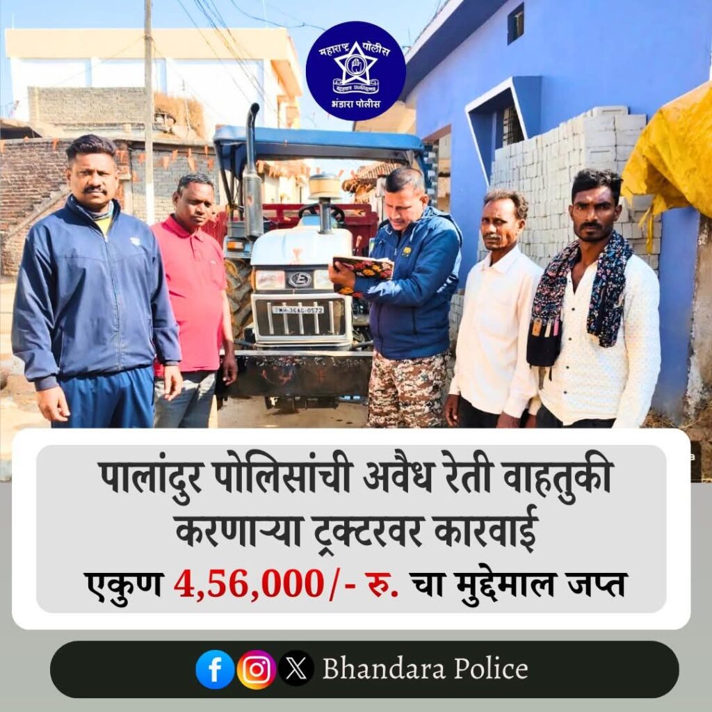 पोलीस स्टेशन पालांदूर अंतर्गत आरोपी नामे ओमप्रकाश सुखराम तरोणे, वय 47 वर्ष, रा. मन्हेगाव /जुना, ता. लाखती, जि. भंडारा, यातील फिर्यादी पो.शि. अंडेल पोलीस स्टॉपसह पेट्रोलींग दरम्यान मौजा मन्हेगाव ता. लाखनी येथे यातील आरोपी हा आपल्या ताब्यातील ट्रॅक्टरचे ट्रॉलीनी रेतीची चोरटी वाहतुक करतांना मिळुन आल्याने व याच्या ताब्यातुन एक सिल्वर रंगाचा आयसर 551 कंपनीचा ट्रॅक्टर क्रमांक एम एच 36 ए.जी. 0572 किंमत ३,००,०००/- रूपये व त्याला जोडुन असलेल्या विनाक्रमांकाची लाल रंगाची ट्रॉली किंमती 1,50000/- रूपये व ट्रॉलीमध्ये अंदाजे एक ब्रास रेती किंमती 6०००/- रूपये असा एकुण 4,56,000/- रूपयाचा मुद्देमाल मिळुल आल्याने आरोपीतां विरुद्ध अप क्र. 45/2026 कलम 305 (ई) भान्यासं. कलमान्वये गुन्हा नोंद.