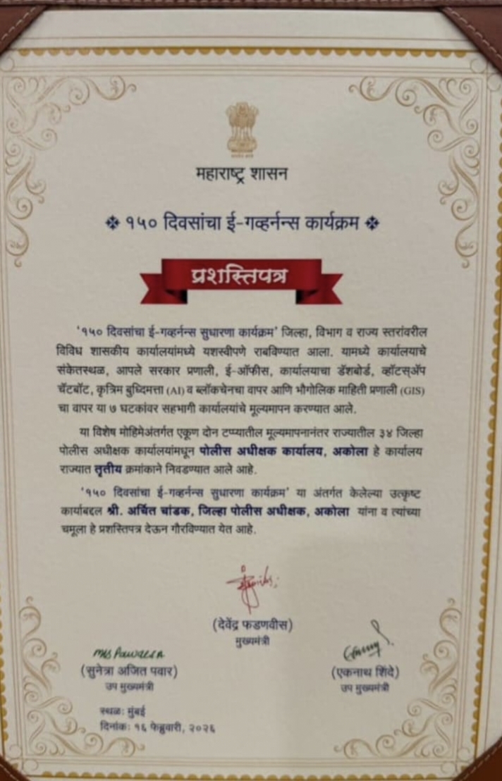 मुंबई येथे आयोजित कार्यक्रमात या प्रशस्तीपत्राने अकोला पोलीस दलाचा सन्मान करण्यात आला. या यशामुळे अकोला पोलीस दलाच्या कार्यक्षमतेवर कौतुकाचा वर्षाव होत आहे.