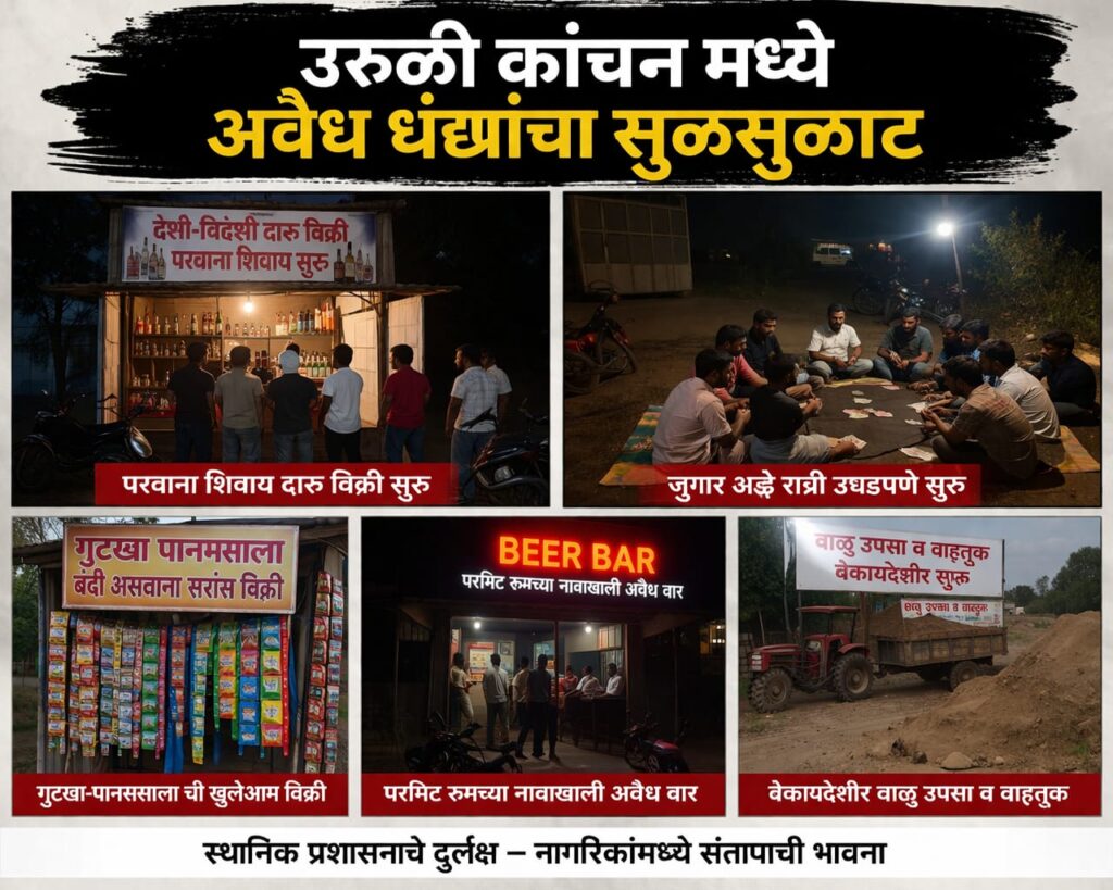 (ता.३०/०३/२०२६ हवेली) परिसरात सध्या अवैध धंद्यांचा सुळसुळाट वाढत असल्याची चिंताजनक स्थिती समोर येत आहे. गावातील जय मल्हार रोड, महात्मा गांधी विद्यालय शाळा परिसरात व बाजारतळ येथील खुलेआम जुगार अड्डे , उरुळी कांचन ची स्मशान भुमी समोर तर एक बंदिस्त रुम करुन राञी उशिरापर्यंत दारू विक्री होते. याच ठिकाणी शाळेची मुले- मुली व महिला वाहनाची वाट पाहत असतात त्यांना दारुड्यांचा नाहक ञास सहन करावा लागत असल्याच्या तक्रारी येत आहे. पण याठिकाणी ठोस कारवाही कधी करणार असे नागरिक सांगत आहेत. तसेच अनेक ठिकाणी दारू बंदी असताना खुलेआम दारू विक्री होते. व नशेली पान शॉपचा ही उद्रेक वाढत चालला असल्याने नागरिकांचे भवितव्य धोक्यात आले आहे. यावर लगाम कधी बसणार?